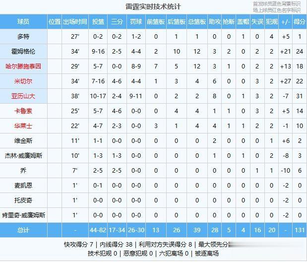 亚历山大31分2板8助、霍姆格伦24分12板3助2断、米切尔22分4板6助、哈尔滕施泰因18分12板3助、卡鲁索14分4板1助、华莱士10分4板4助、乔6分