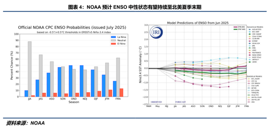 宏观视角—7月ENSO展望报告指出,2025年7-9月热带太平洋中东区域维持中性状态的概率接近90%,中性状态有望持续至北美夏季末期,进而典型由拉尼娜触发的“热穹顶”形成动力可能不足,意味着夏季出现极端高温事件的强度与持续时间可能趋于减弱。