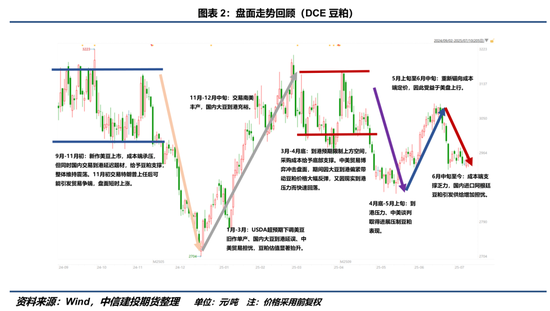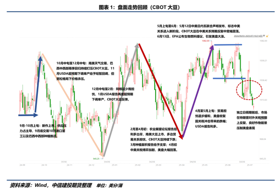 我们在2024年年报中指出,本年度全球大豆市场处于库存重建周期,价格中枢相较上一年度将出现明显回落。事实上,若将时间维度拉长,可以清晰地观察到CBOT大豆与DCE豆粕正处于低位区间震荡,这一低位区间的确立,最初由2024年6月至8月北美产区“风调雨顺”的天气条件奠定基础,随后南美大豆丰产进一步巩固了这一趋势。展望下半年,我们认为在未有实质性证据表明北美供应端将出现显著减产之前,全球大豆供应宽松格局难以被逆转,进而使得豆类商品价格中枢难以获得脱离震荡区间的上行动能。具体到交易层面,我们理解月度以及季度尺度的交易逻辑大致锚向“北美天气—中美贸易关系—美国生物燃料政策”三重定价框架,更远的叙事则等待四季度南美新季大豆种植开启。