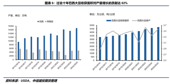 从年度视角来看,近年来阿根廷大豆年产量除了2023年因“三峰拉尼娜”导致产量骤减外,其余年份均维持在5000万吨以内。与此形成对比的是,巴西大豆产量呈现出稳定增长的态势,正稳步向1.7亿吨迈进。进一步对产量增长的驱动因素进行分解,可以发现过去十年间,巴西大豆产量主要增长动力来源于种植面积的持续扩张。这种面积扩张的背后,得益于相对可观的种植利润。我们在2024年年报中曾提及,与美国农户普遍需要支付土地租金不同,巴西多数农业耕地为农户自有,这使得他们无需承担土地租金这一重要成本项,从而在一定程度上保障了种植利润,并激励了面积的扩张。USDA预计2025/26年度巴西大豆产量将达到1.75亿吨。在理想天气条件下,我们理解这一产量预期具有较高的实现概率。