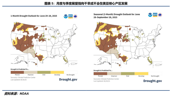 中观视角—NOAA月度与季度展望报告显示,干旱状况将局限于内布拉斯加州及邻近区域,包括爱荷华州、伊利诺伊州在内的中西部核心大豆产区基本处于无旱等级。此外,报告亦未显示干旱将大范围向东蔓延的趋势,这暗示中西部大豆整体生长环境偏有利。