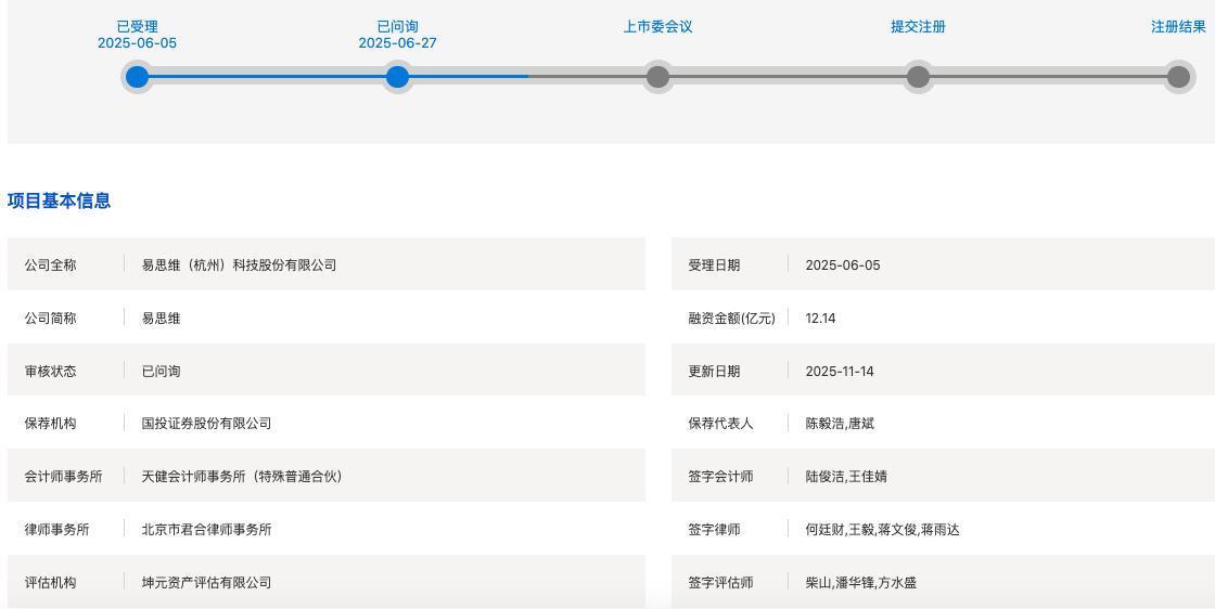 上交所11月14日公告称,上市委将于2025年11月21日审议易思维(杭州)科技股份有限公司(以下简称”易思维“或”公司“)科创板IPO项目。