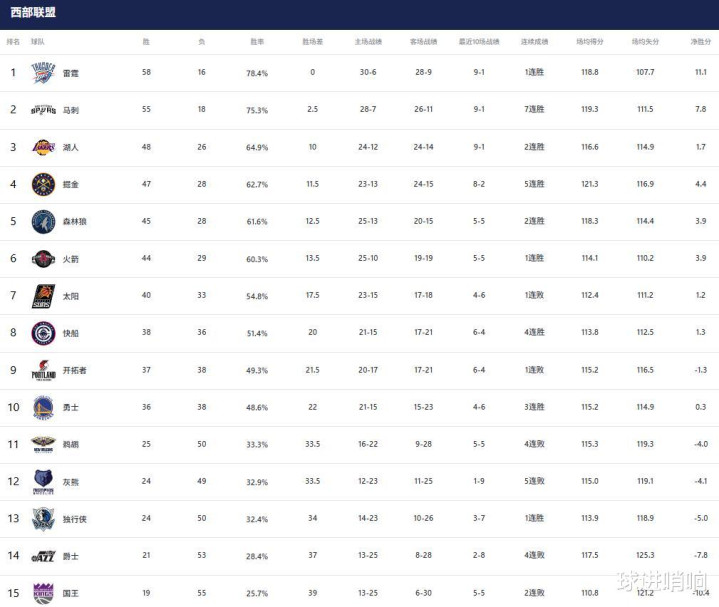 太阳落后火箭4个胜场,勇士领先11名的鹈鹕11.5个胜场,这让几支球队基本锁定附加赛席位,只是具体的排名归属还有小幅度的悬念。