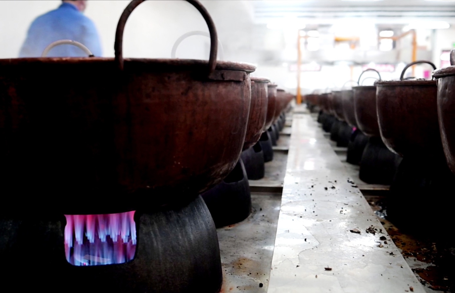 步入膏方楼一楼,热气腾腾的膏方制作间内,随着浸泡6个多小时的药材入锅,一百口紫铜锅的炉火熊熊燃烧仁信,经过老药工们的不断搅拌,一阵阵浓郁的药香扑面而来……海派膏方制作技艺传承人、该院药学部朱晓春副主任药师展示了“挂旗”技艺。